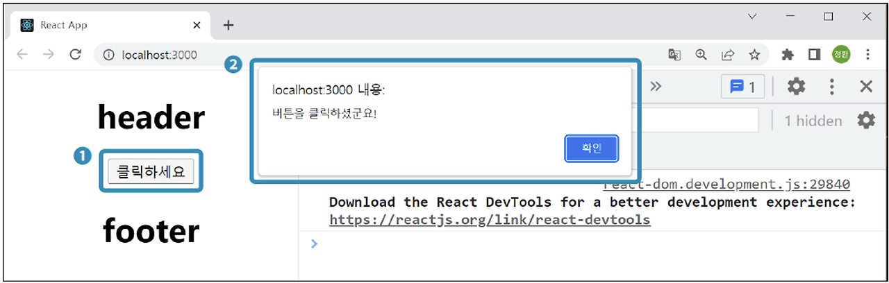 버튼을 클릭하면 handleOnClick 이벤트 핸들러가 실행되어 입력 폼에 작성한 텍스트를 메시지 대화상자에 표시한다.