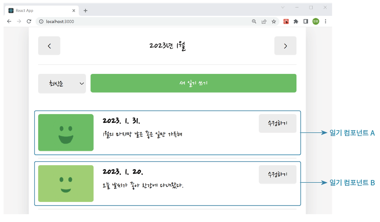 - Header.js에서 내보낸 Header 컴포넌트를 불러와 App 컴포넌트의 자식으로 배치했다.