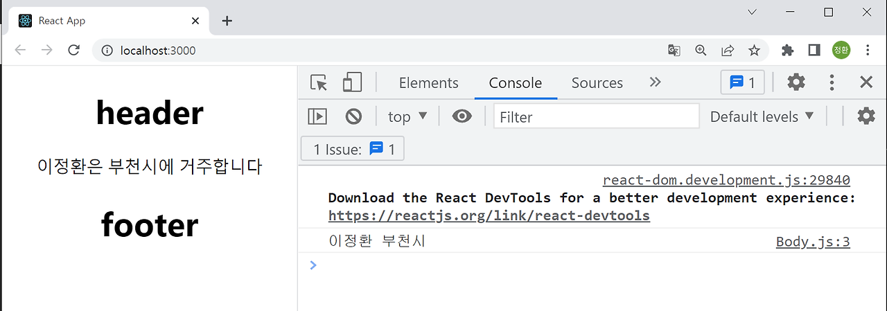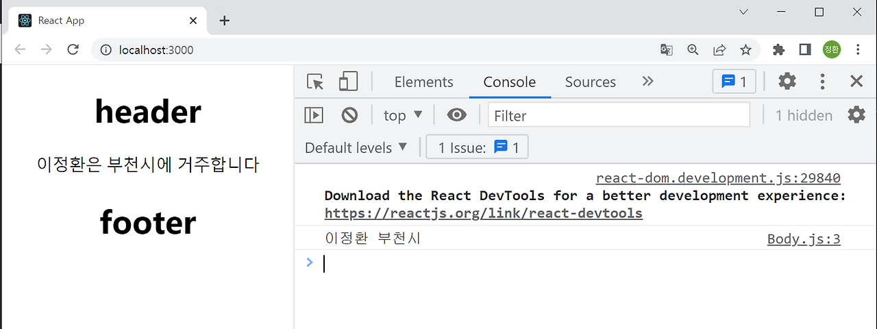 이후, Body와 Footer 컴포넌트를 각각 생성하고 App.js에 추가했다.