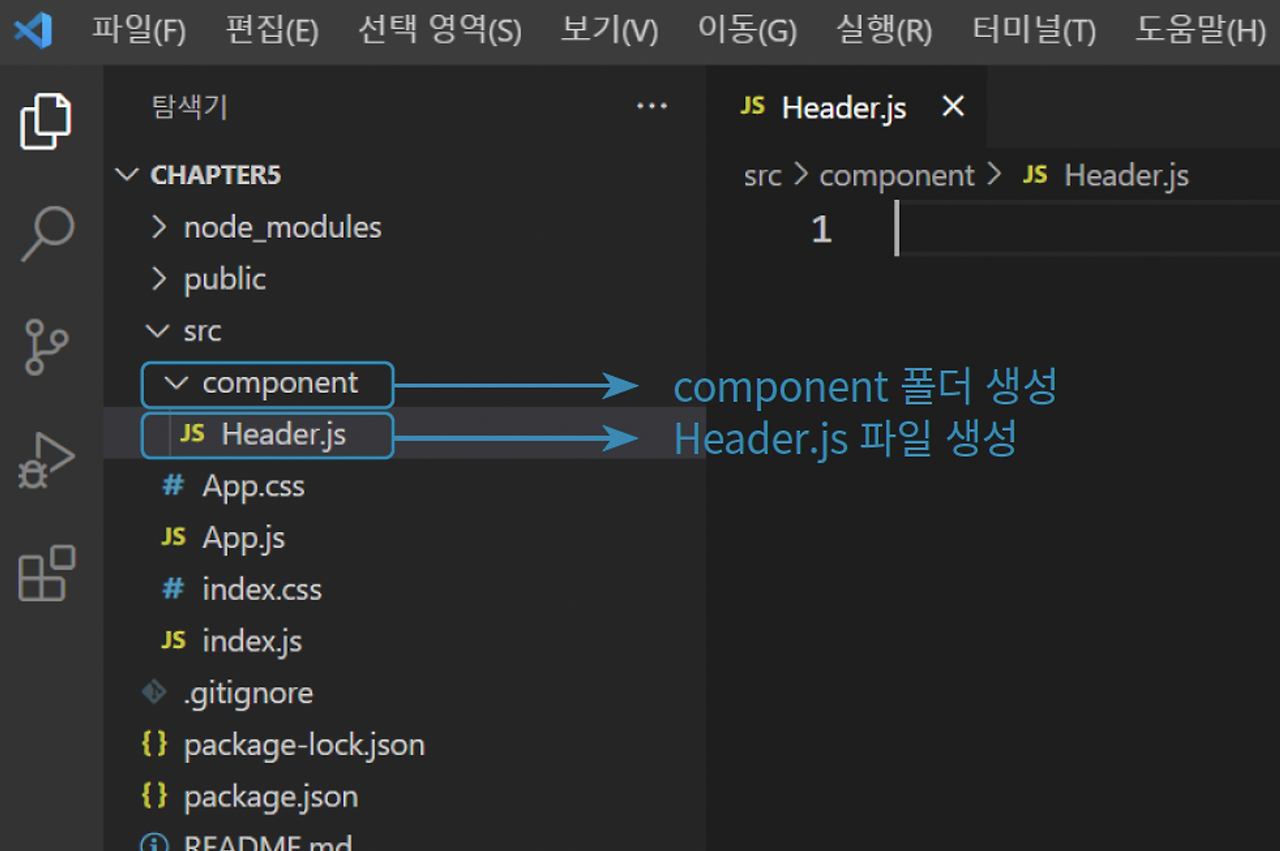 component 폴더를 만들고, Header.js 파일을 생성했다.