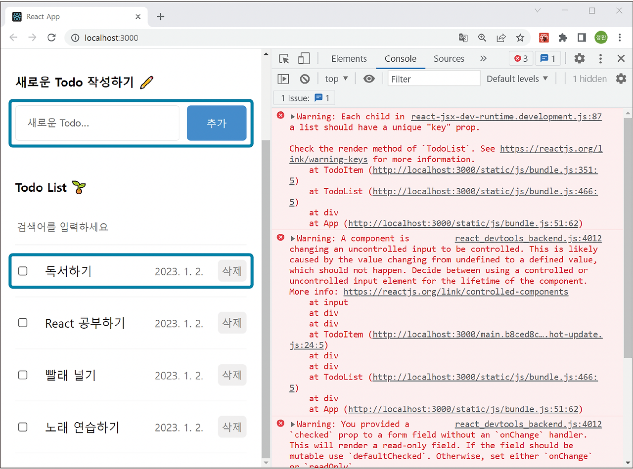 할 일 아이템을 선택해 <삭제> 버튼을 클릭하여 아이템이 잘 삭제되는지 페이지에서 확인한다.