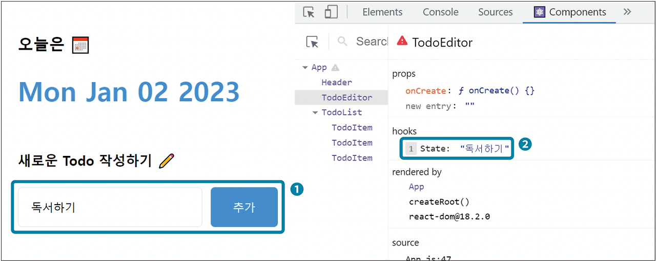 - State 변수 todo가 업데이트되면 TodoList 컴포넌트에 전달한 Props의 값도 변경된다.