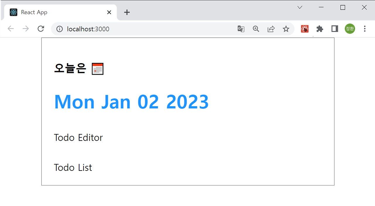 먼저 페이지 레이아웃을 구성합니다. App.js에 임시 내용을 추가합니다.