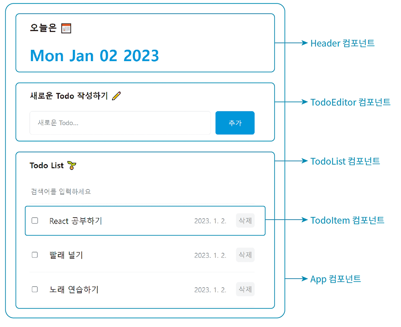 다음은 [할 일 관리] 앱의 컴포넌트 구조입니다.