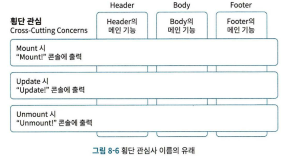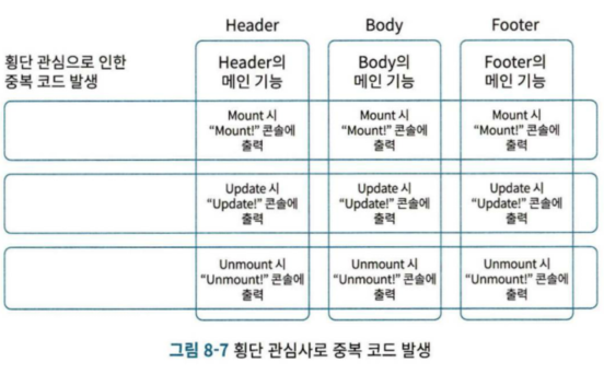 - 횡단 관심사 (Cross-Cutting Concerns): 여러 컴포넌트에서 공통으로 사용되는 로직이나 기능을 의미합니다. 로깅, 인증, 에러 처리 등이 이에 해당합니다.