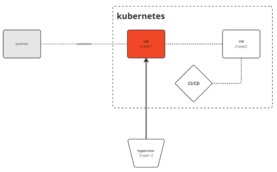 - Hypervisor [hyper-v]는 VM [node1]을 호스팅하며, 이 VM은 Kubernetes 클러스터의 노드로서 기능합니다.