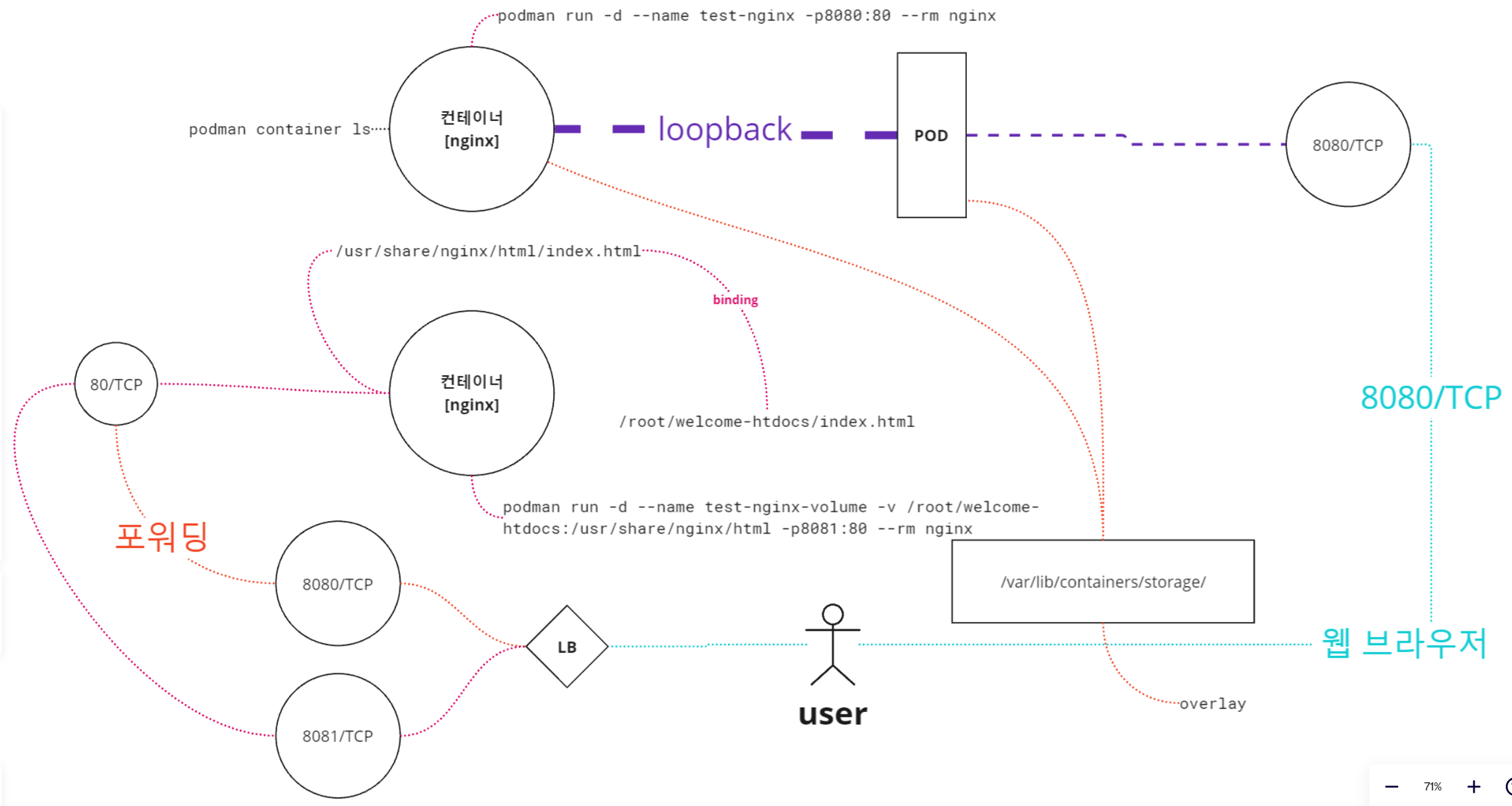 이 다이어그램은 Podman을 사용하여 Nginx 컨테이너를 실행하고 관리하는 다양한 시나리오를 설명합니다.
