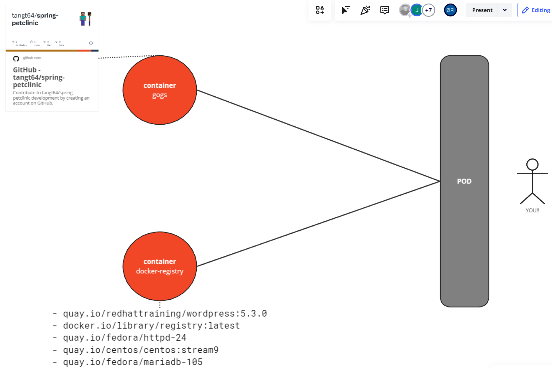 - 이 Pod는 gogs와 docker-registry 컨테이너를 포함하고 있으며, 이 컨테이너들은 동일한 네트워크와 스토리지를 공유합니다.