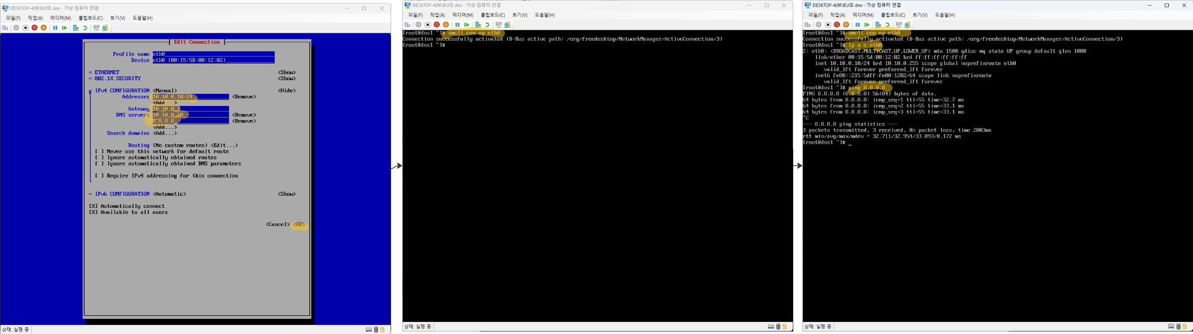nmcli 명령어를 사용하여 설정을 적용하고 확인합니다.
