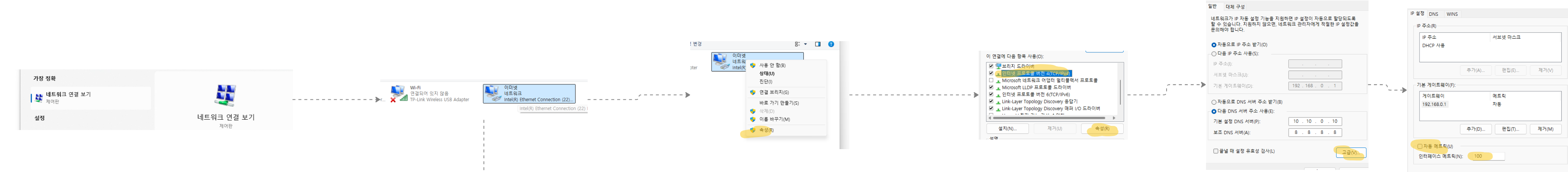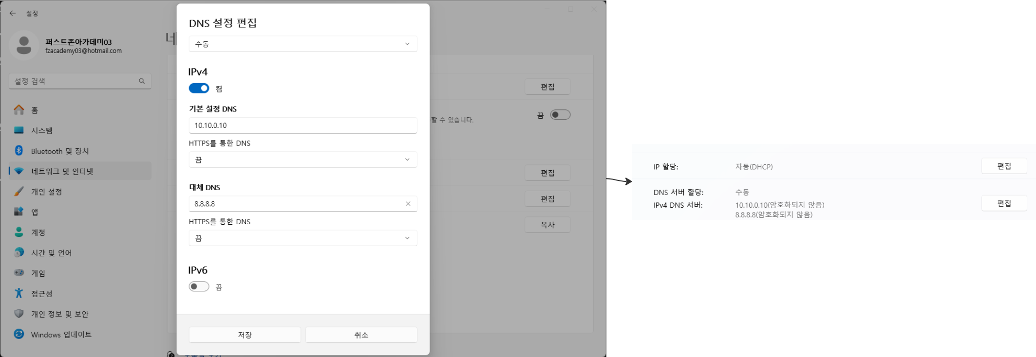 네트워크 어댑터의 속성을 설정하여 IP 주소와 DNS 서버를 지정합니다.