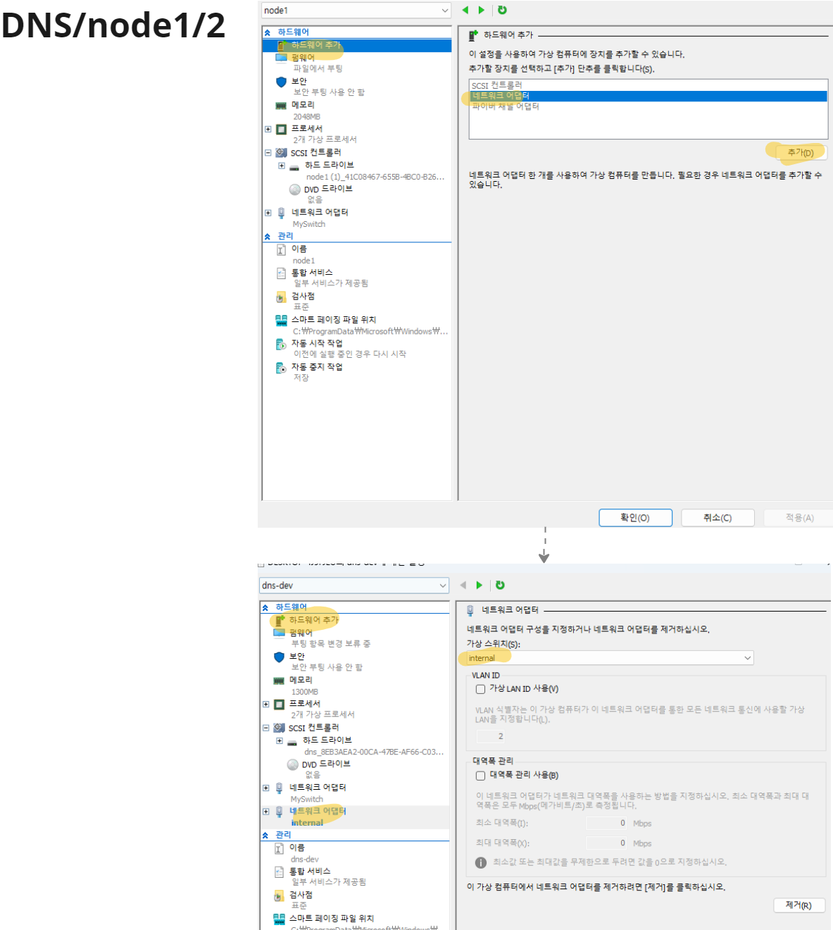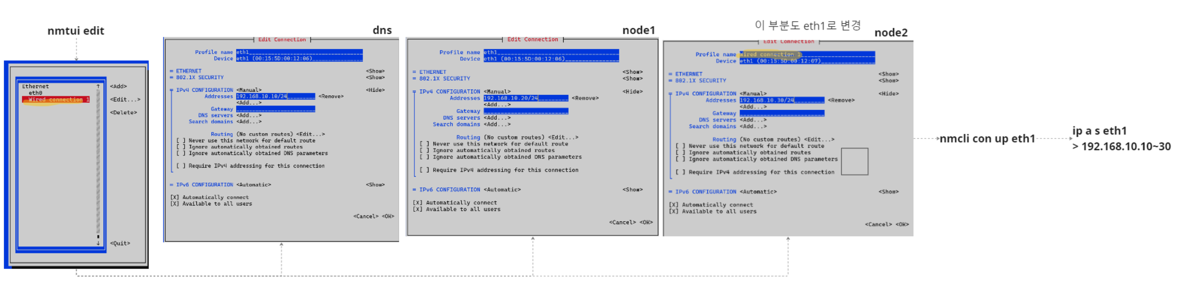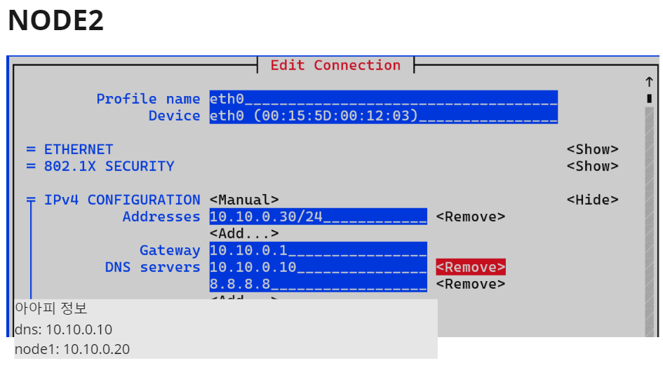 DNS 및 노드 1과 2에 대한 네트워크 설정 과정을 자세히 설명하겠습니다. 아래 이미지들을 참조하여 단계별로 설명합니다.
