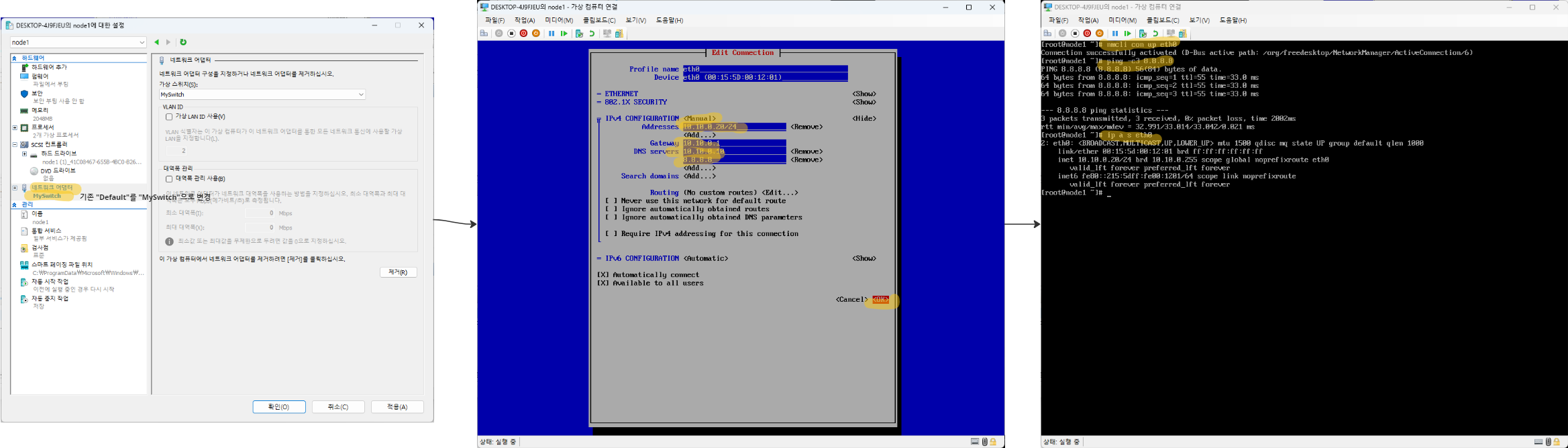 nmtui와 nmcli를 사용하여 네트워크 설정을 수정하고, Hyper-V 환경에서 가상 스위치를 설정하여 고정 IP를 할당하는 방법을 설명했습니다.