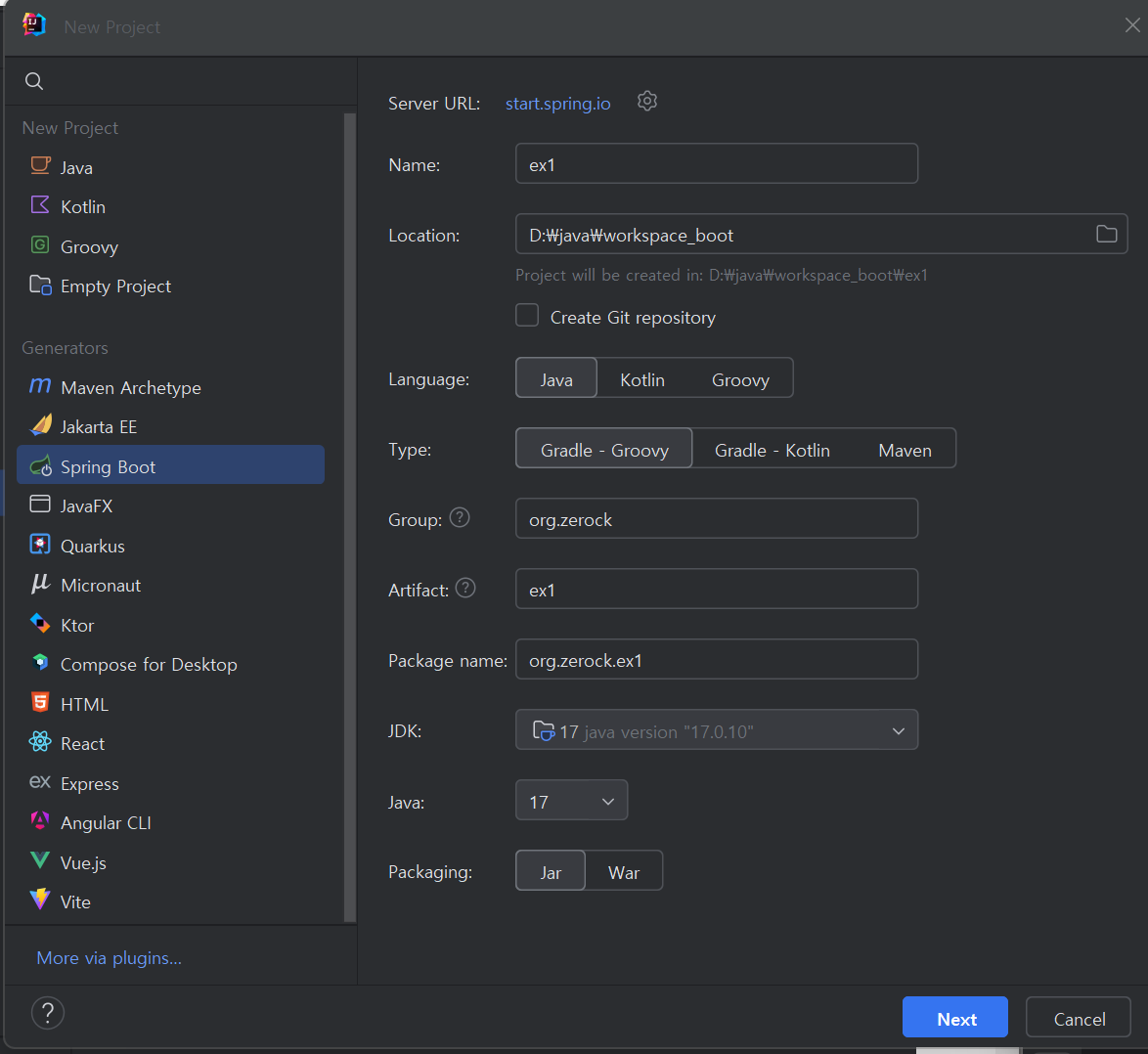 생성된 프로젝트는 압축 파일 형태로 제공되며, 이를 다운로드하여 원하는 디렉토리에 압축을 풀었다.