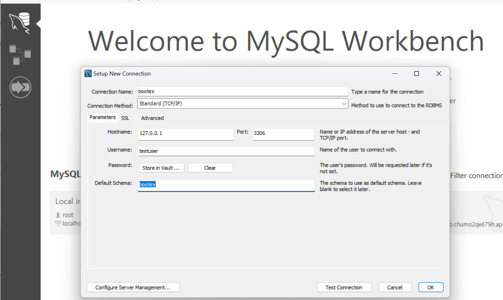 호스트는 127.0.0.1, 포트는 3306, 사용자 이름, 비밀번호를 입력하고, 기본 스키마를 bootex로 설정했다.
