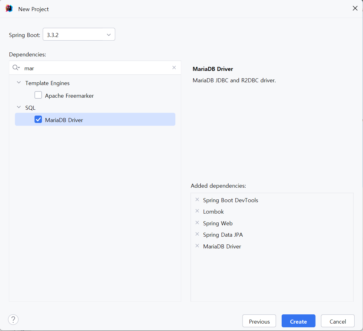 MySQL(MariaDB) 드라이버와 함께 Lombok, Spring Boot DevTools, Spring Web, Spring Data JPA를 추가했다.