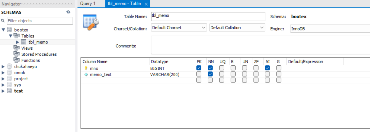 Spring Boot 애플리케이션을 실행하면 JPA와 Hibernate가 데이터베이스에 연결되어, tbl_memo 테이블이 자동으로 생성된다. 이를 MySQL Workbench를 통해 확인할 수 있다.