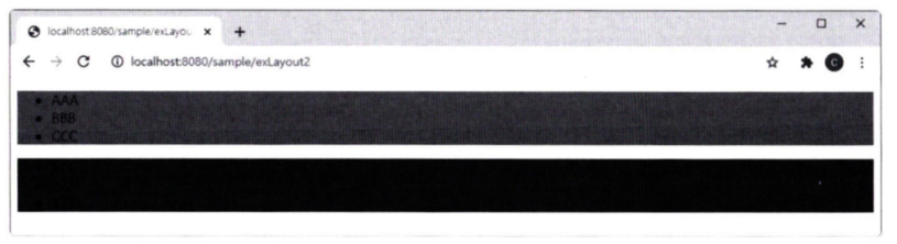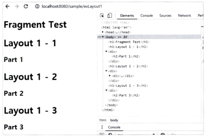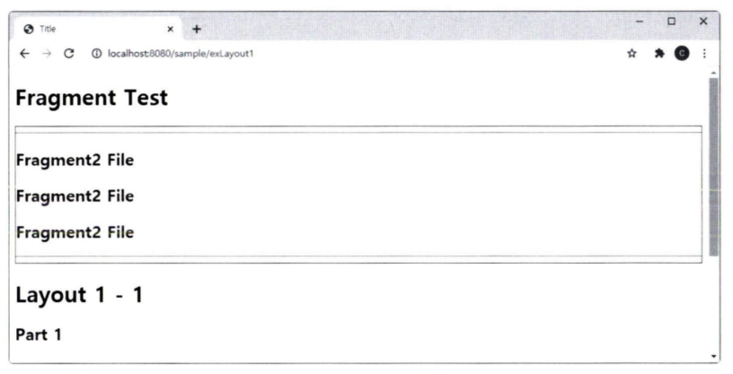 브라우저에서 /sample/exLayout2 URL을 확인하면, fragment3.html의 내용에 exLayout2.html에서 전달된 태그들이 포함되어 출력된 것을 확인할 수 있습니다.