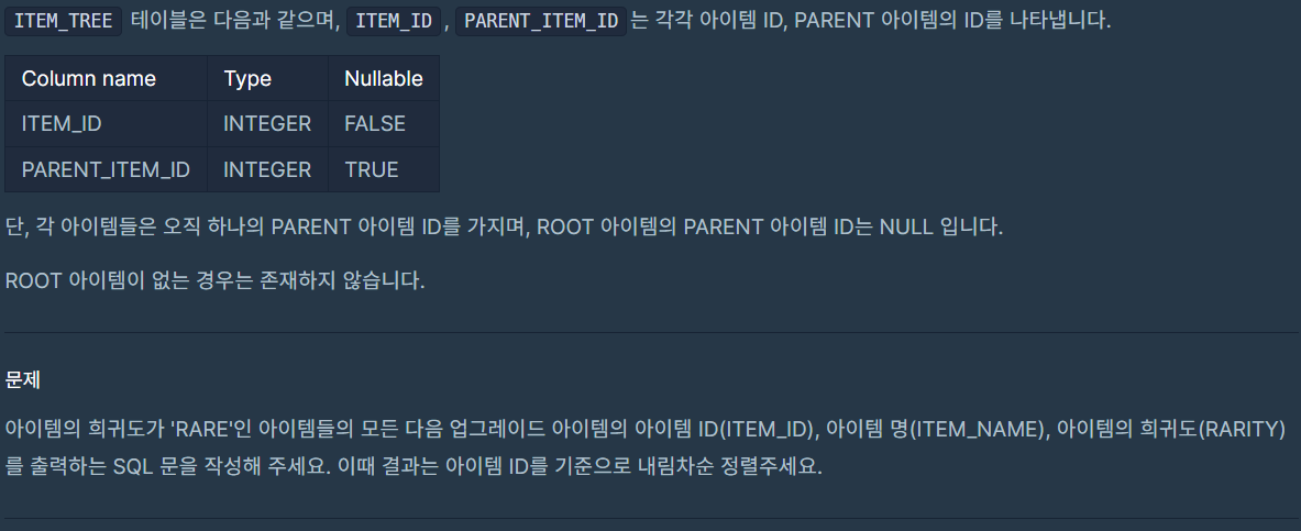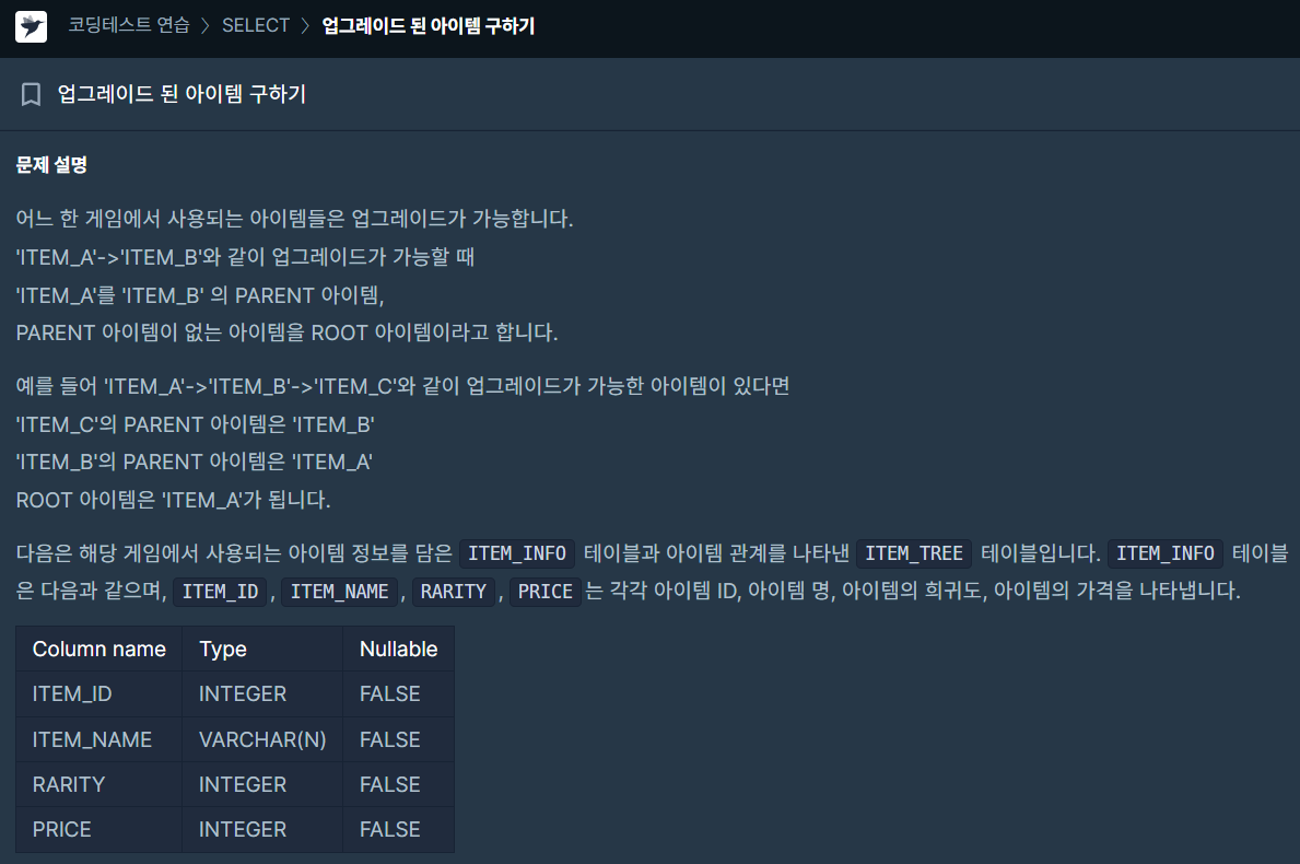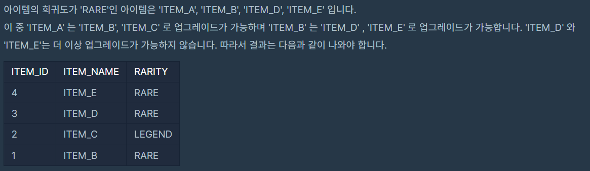 - 주어진 문제는 게임에서 사용되는 아이템들이 업그레이드 가능한지 확인하고, 희귀도가 'RARE'인 아이템들의 다음 업그레이드 아이템을 찾아야 했다.
