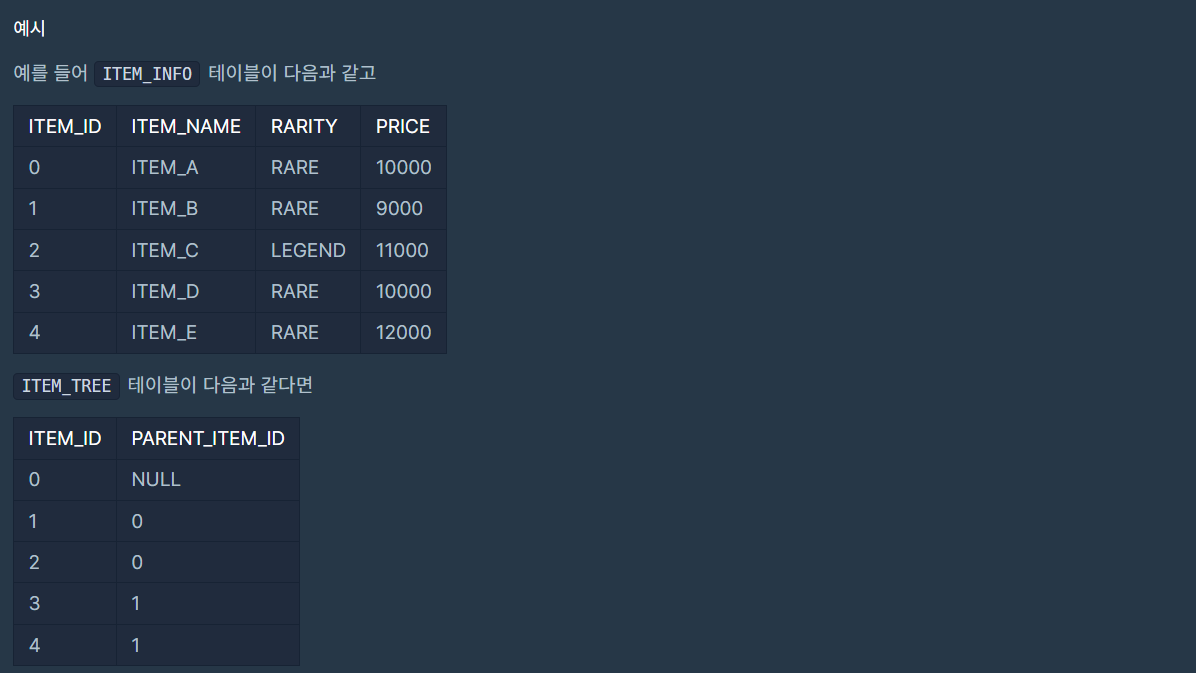 ITEM_INFO테이블은 각 아이템의 정보를 담고 있었다. 이 테이블에는ITEM_ID,ITEM_NAME,RARITY,PRICE컬럼이 있었다.ITEM_TREE테이블은 아이템 간의 업그레이드 관계를 나타내고 있었다. 이 테이블에는ITEM_ID와PARENT_ITEM_ID컬럼이 있었다.