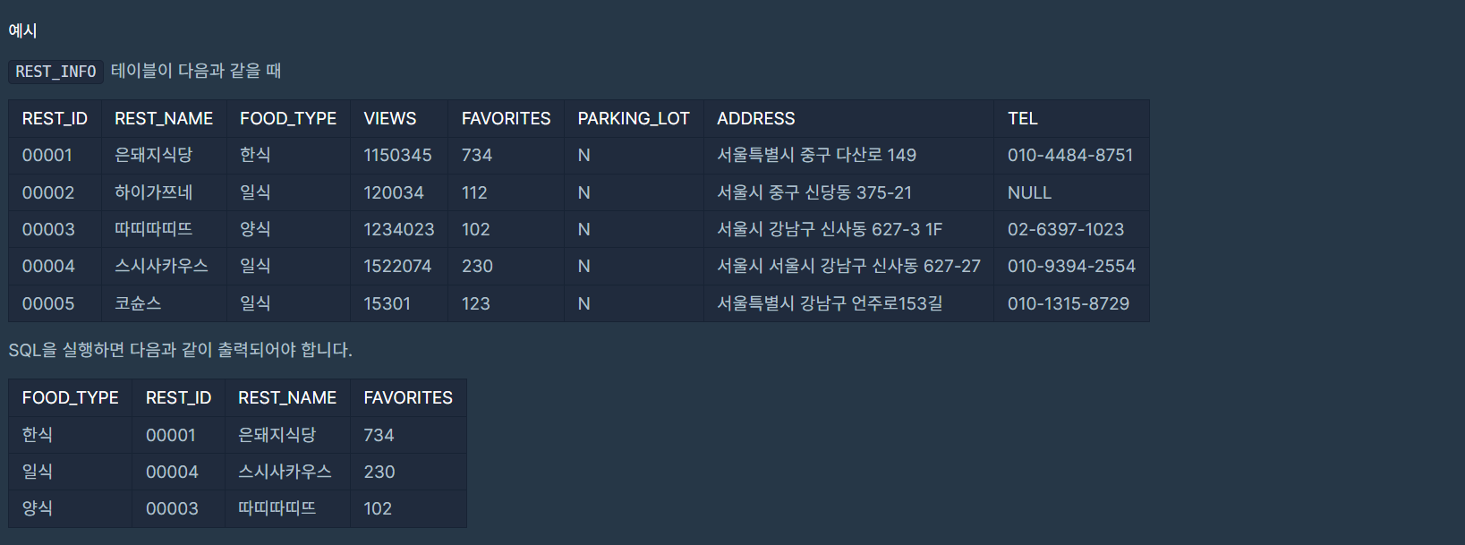 메인쿼리: SELECT FOOD_TYPE, REST_ID, REST_NAME, FAVORITES FROM REST_INFO WHERE (FOOD_TYPE, FAVORITES) IN ( SELECT FOOD_TYPE, MAX(FAVORITES) FROM REST_INFO GROUP BY FOOD_TYPE ) ORDER BY FOOD_TYPE DESC;