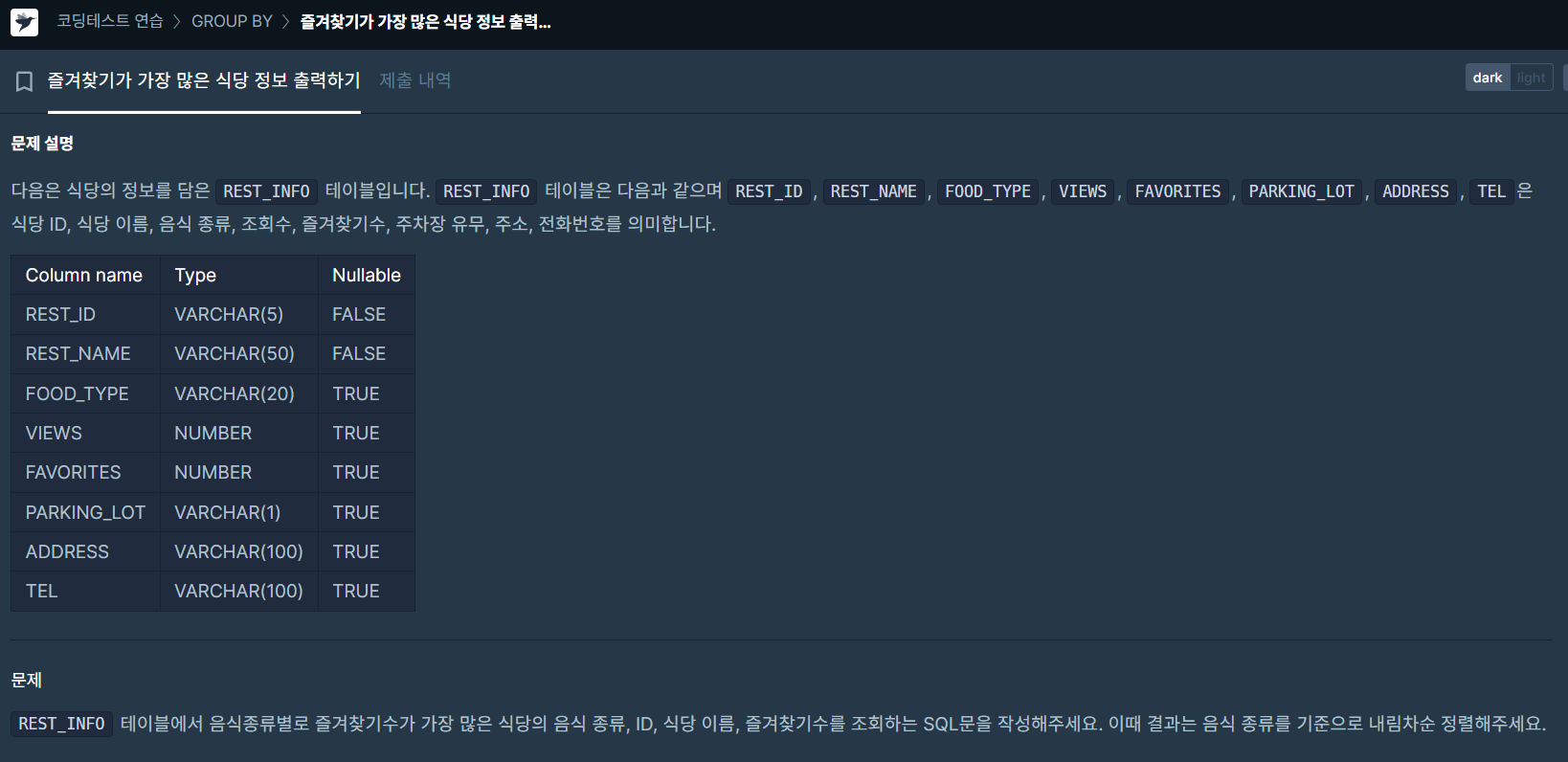 이 문제는 REST_INFO 테이블에서 음식 종류별로 즐겨찾기 수가 가장 많은 식당의 정보를 조회하는 것이다.