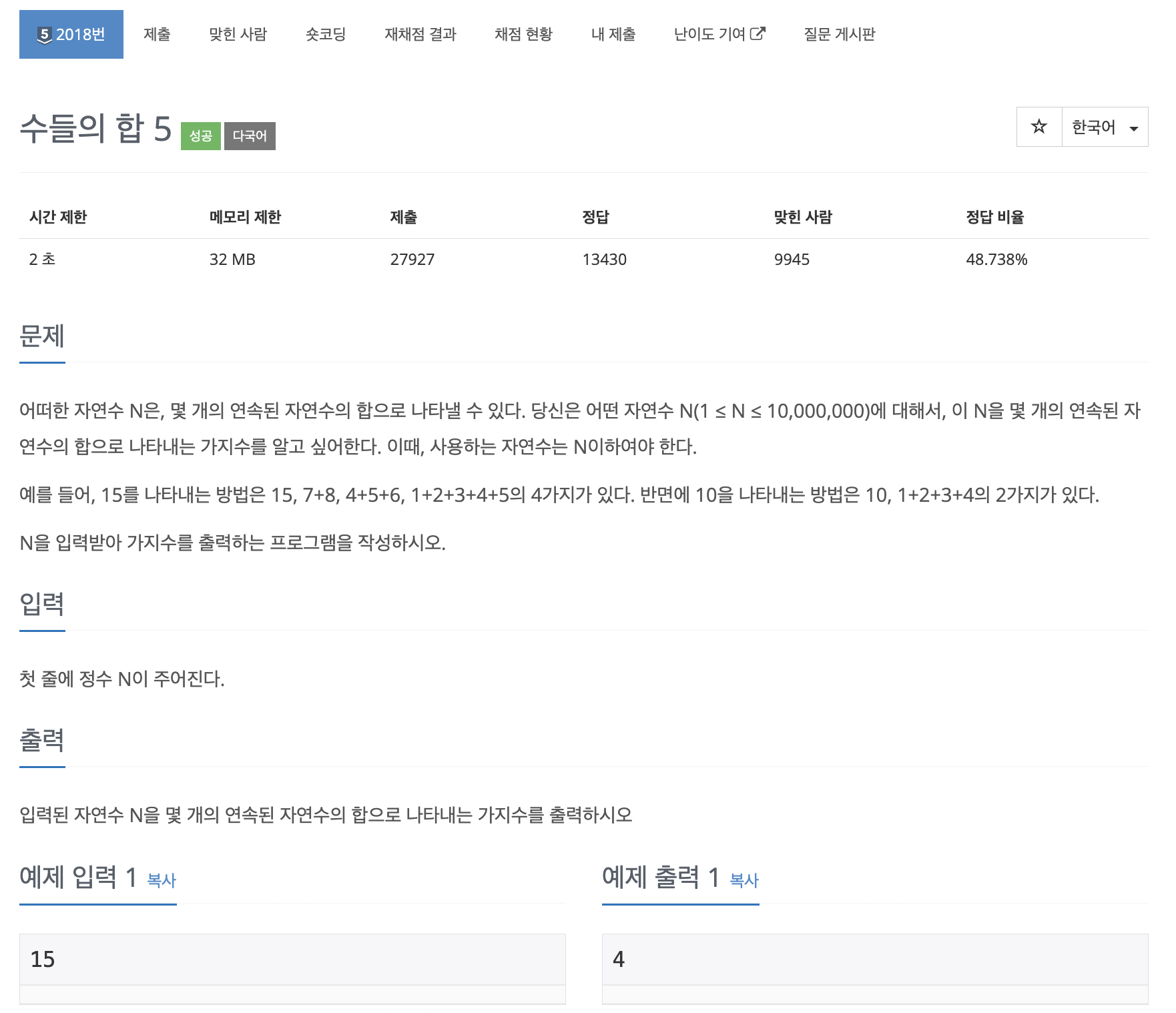 [백준 2018번] 수들의 합 5 (Python3, 실버5) 본문