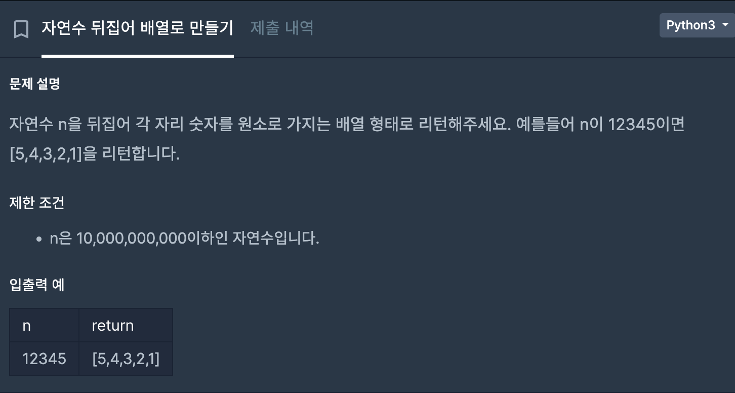 [프로그래머스 코딩테스트 연습] 자연수 뒤집어 배열로 만들기 (Python3) 본문