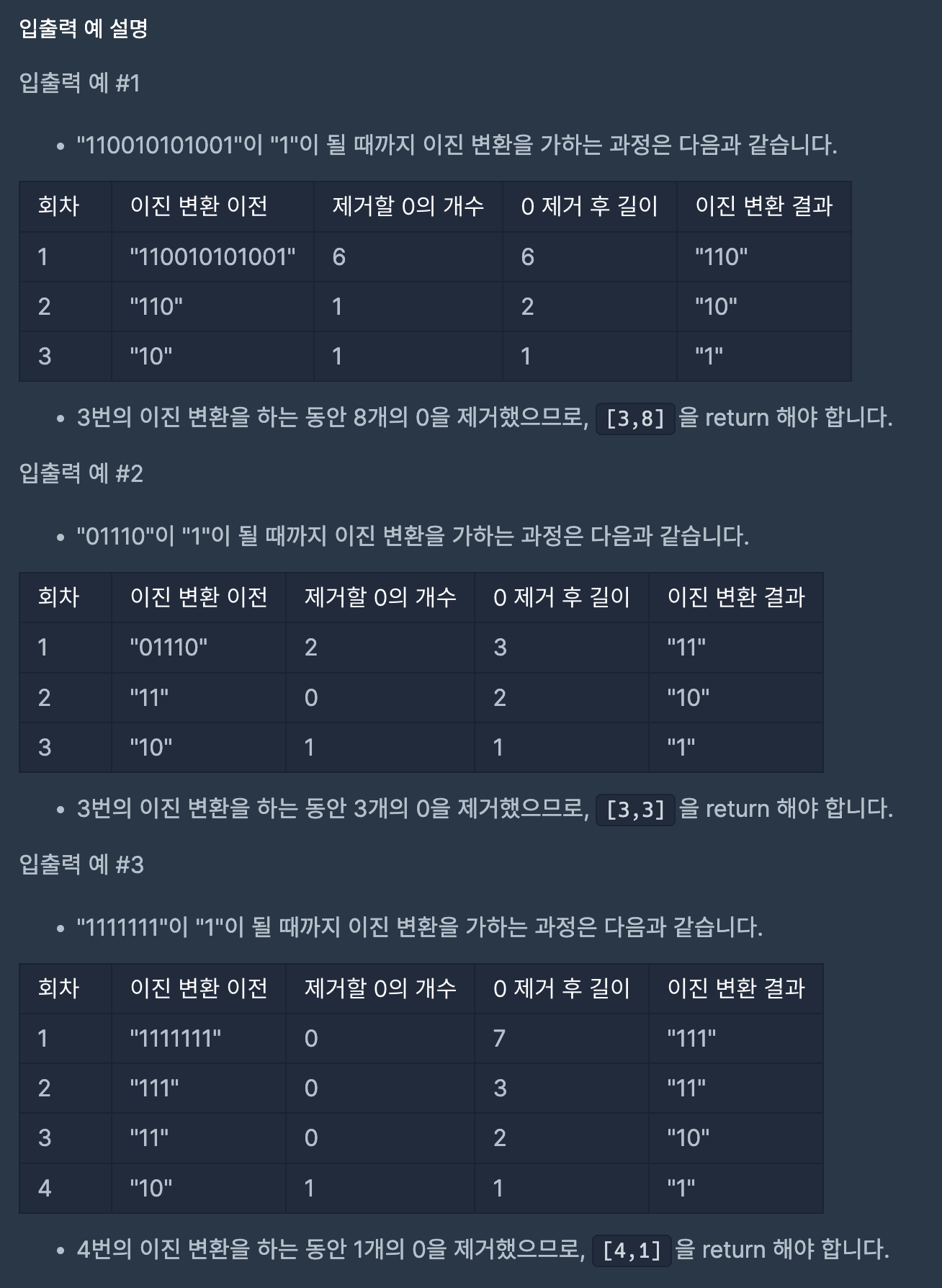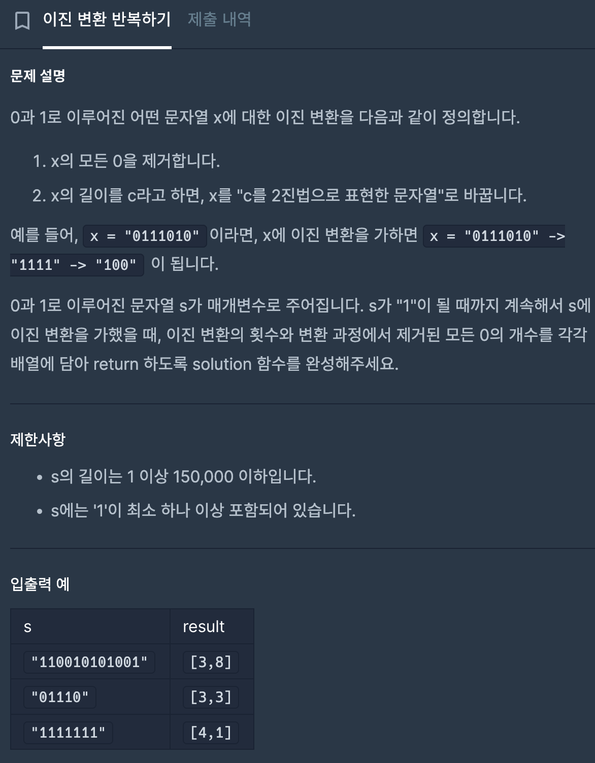 [프로그래머스 코딩테스트 연습] 이진변환 반복하기 (Python3) 본문