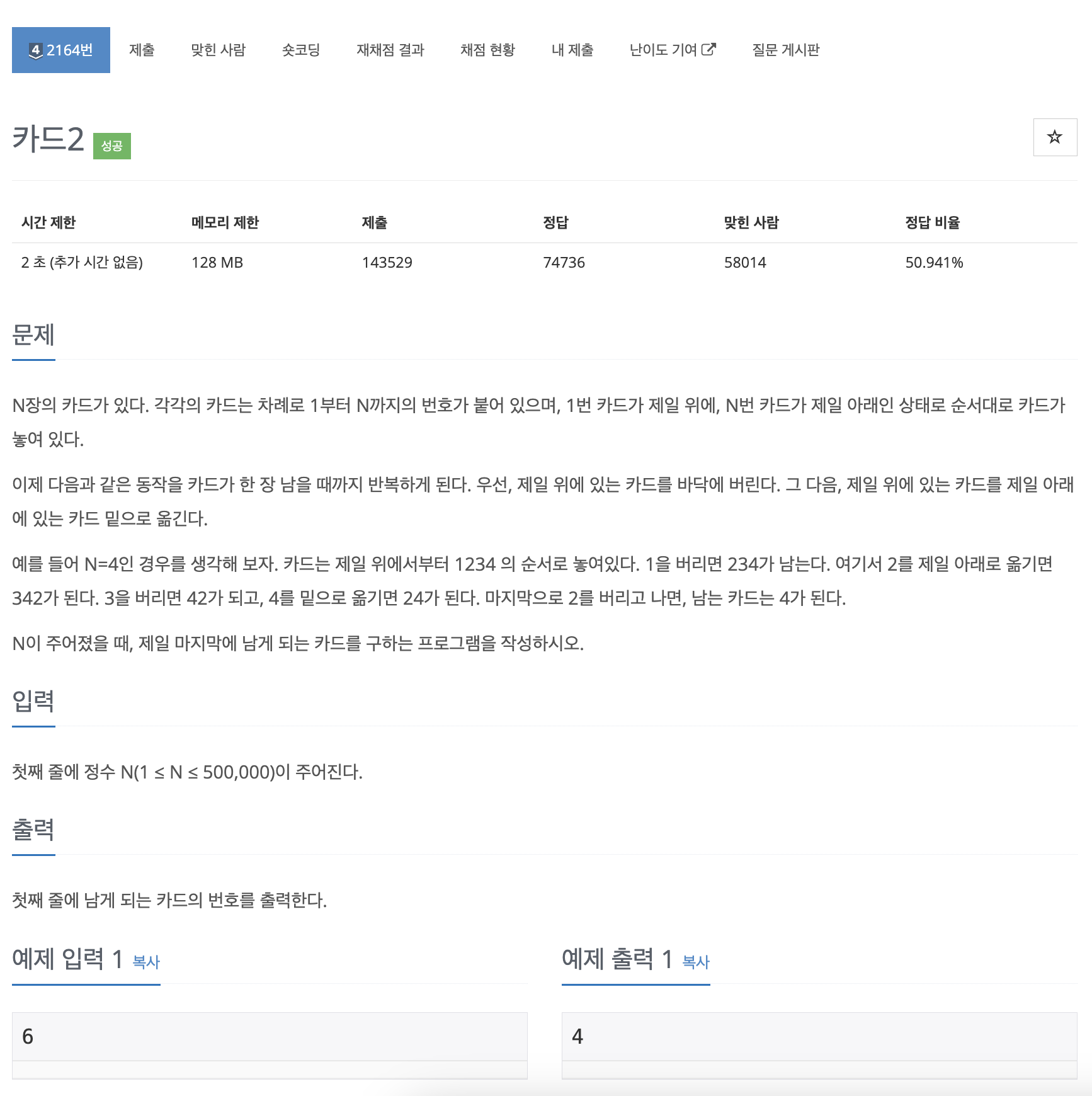 [백준 2164번] 카드2 (Python3, 실버4) 본문