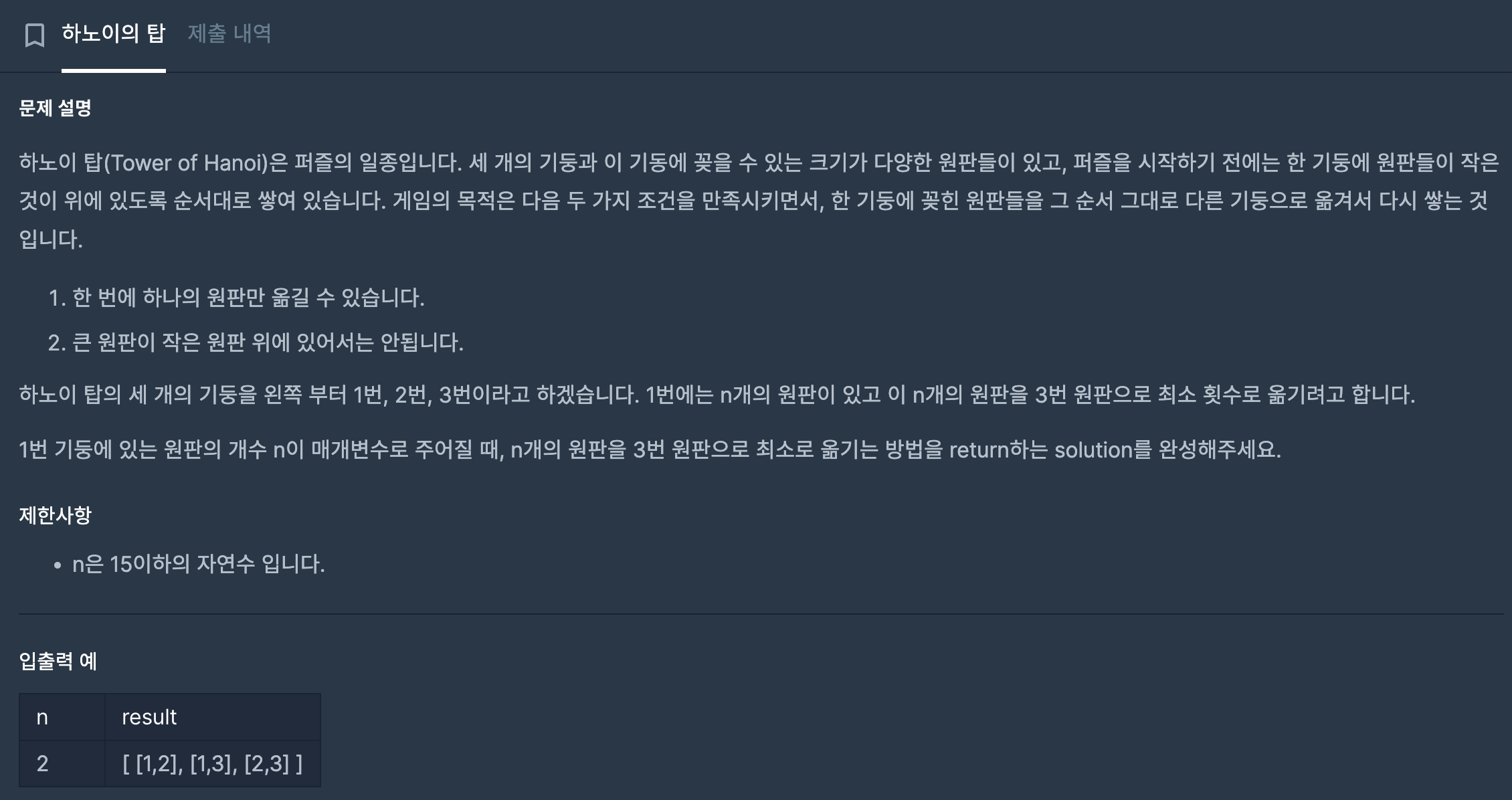 [프로그래머스 코딩테스트 연습] 하노이의 탑 (Python3) 본문