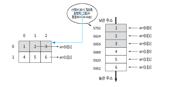배열이 다차원이더라도 실제로는 1차원 공간에 저장함. 즉, 배열은 차원과 무관하게 메모리에 연속 할당된다.