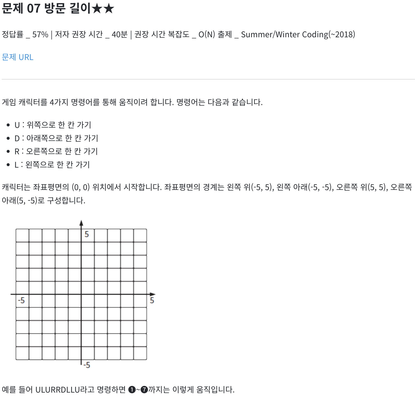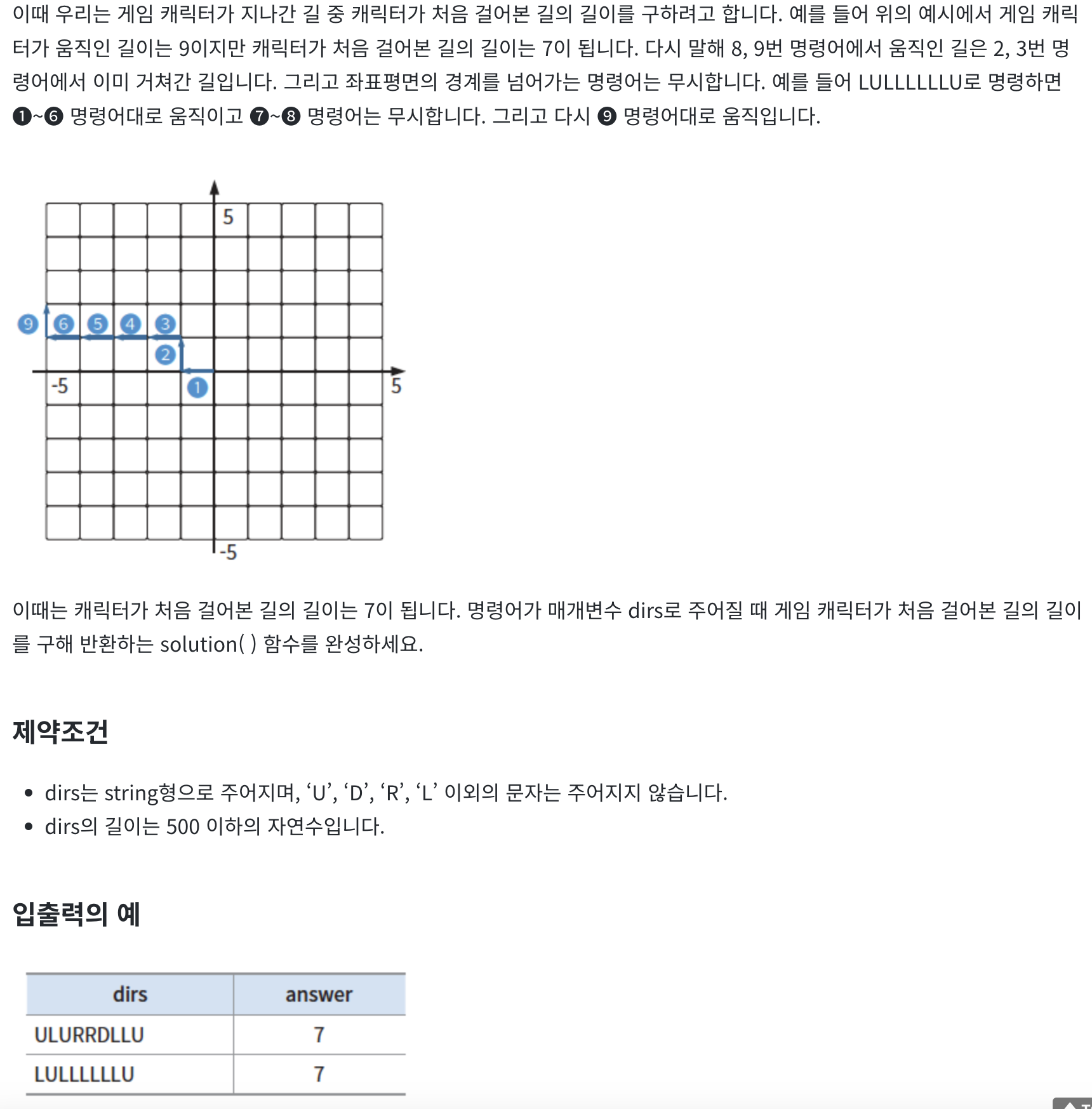 두 번째, 음수 좌표를 포함한다는 점입니다. 문제를 보면 좌표 범위는 -5 <= x, y <= 5입니다. 2차원 배열에서 음수 인덱스를 사용할 수는 없으므로 다른 방법을 생각해야 합니다. 문제의 핵심은 원점에서 출발해 최종 경로의 길이를 구하는 건데, 좌표는 방향에 의해서만 제어된다는 점입니다. 따라서 원점을 (0, 0)에서 (5, 5)로 바꿔 음수 좌표 문제를 해결해도 됩니다. 구현 문제는 답안 코드의 길이가 긴 경우가 많으므로 기능별로 함수를 구현하는 게 좋습니다. 일단 하나의 함수로 전체 동작을 구현해보고 이후 함수로 나누는 연습을 해보기 바랍니다.