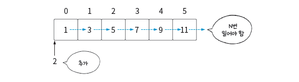 - 중간에 데이터를 삽입할 일이 많다면 배열은 비효율적입니다. 다른 방법을 생각해야 합니다.
