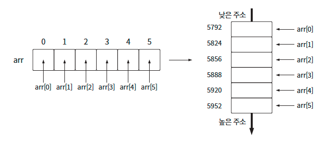 배열의 각 데이터는 메모리의 낮은 주소에서 높은 주소 방향으로 연이어 할당됩니다.