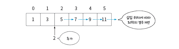 다시 말해 현재 삽입한 데이터 뒤에 있는 데이터 개수만큼 미는 연산을 해야 한다.