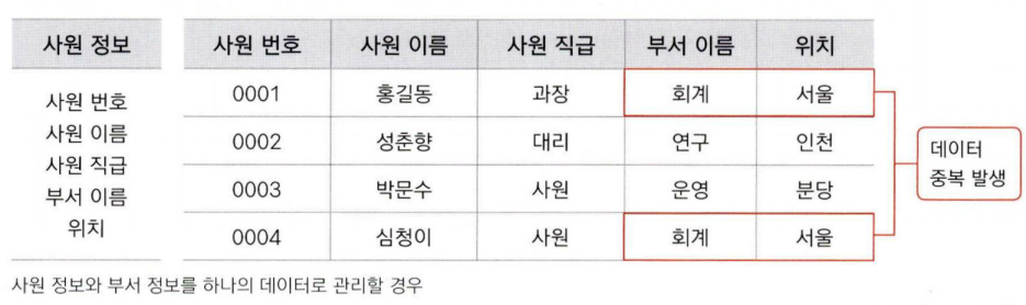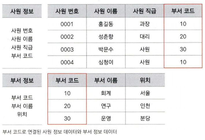 따라서 중복 발생할 수 있는 데이터는 별개의 relation으로 정의한 후, 부서 코드를 포함한 사원 정보 데이터와 부서 정보 데이터를 연결한다.