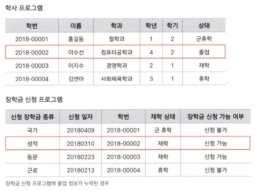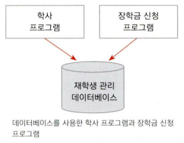 아래 그림처럼 학생과 관련된 일련의 데이터를 한곳에 모아 관리하고, 각각 응용프로그램이 함께 사용하면 데이터를 직접 관리할 때 발생할 수 있는 데이터의 오류, 누락, 중복을 해결할 수 있다.