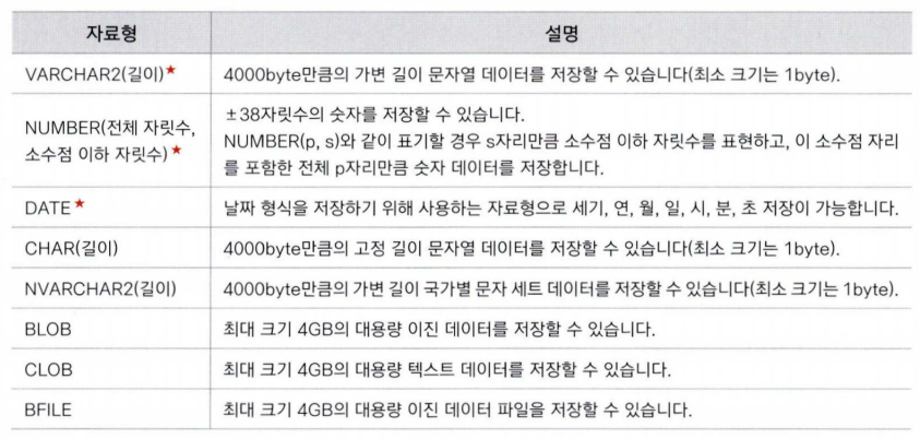 NUMBER(전체 자릿수, 소수점 이하 자릿수) : 숫자데이터, NUMBER(p,s)는 s자리만큼 소숫점 이하 자리수 표현, 소수점 자리를 포함한 전체 p자리 숫자 데이터 저장.
