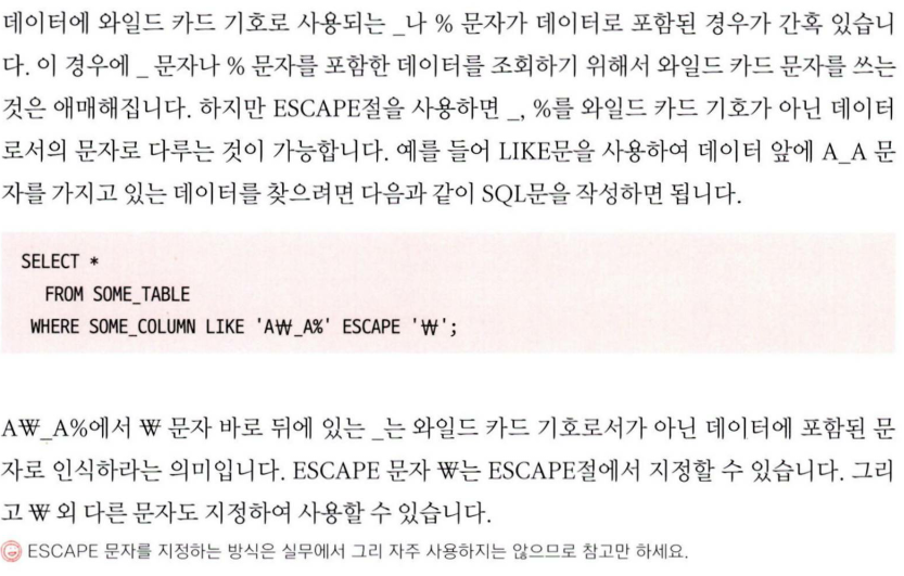 ESCAPE 절을 사용하면 와일드카드 기호가 아닌 데이터로서의 문자로 다루는 것이 가능해짐. (자주 사용 안 함)