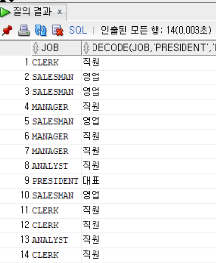 select job, decode(job, 'PRESIDENT', '대표', '직원') from emp;