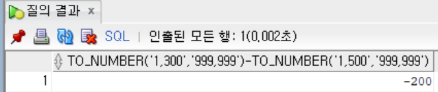 SELECT TO_NUMBER('1,300', '999,999') - TO_NUMBER('1,500', '999,999') FROM DUAL;