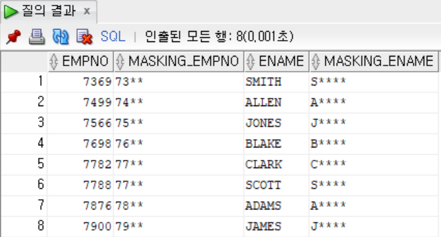 ename, substr(ename,0,1)|| RPAD('*', LENGTH(ENAME) - 1, '*') AS MASKING_ENAME